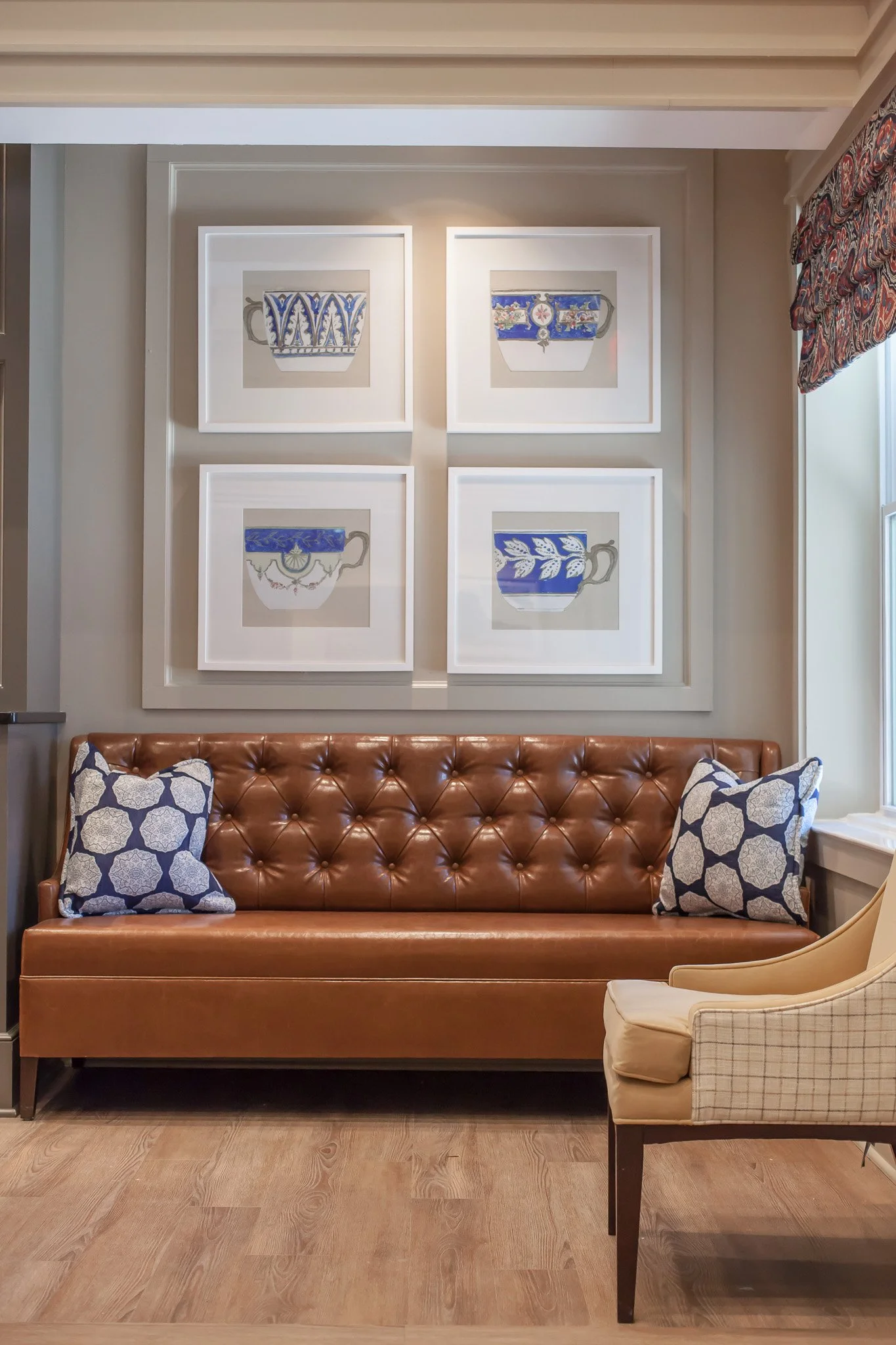 In response to our client’s vision, we created a design that followed the more traditional lines of a southern country club while accenting rooms with fresh, modern details. The traditional southern theme can be seen in pieces like the timeless tufted back barrel chairs, the use of nailheads, and the navy plaid upholstery used throughout the community. Our designers chose a color palette of various rich, dark browns that are utilized in the classic millwork and leather seating, while also incorporating navy blues, vibrant yellows, and deep reds for drapery, seating, and accessories. We also chose to make use of custom wallpaper and a bold, patterned custom carpet to better set the amenity spaces apart. As a part of our client’s FF&E package, our designers curated a unique collection of art specifically for Braselton. These curated pieces were used to tie the country club theme together throughout the community.